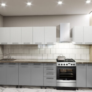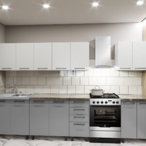 Bucătărie modulară „Modern” 2.4m cu fatade PAL. Seria „Y”. – mobilier de bucătărie modern și confortabil pentru orice cameră, fie că este un mic apartament, casă sau căsuță de vară. Dulapurile disponibile conțin ustensile de bucătărie, vase, cristal și mâncare. O bucătărie frumoasă, care este capabilă să ofere o atmosferă specială de confort.