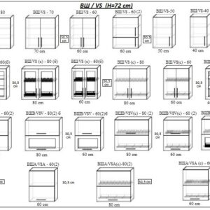 - Inălțimea dulapurilor superioare standard 72 cm.