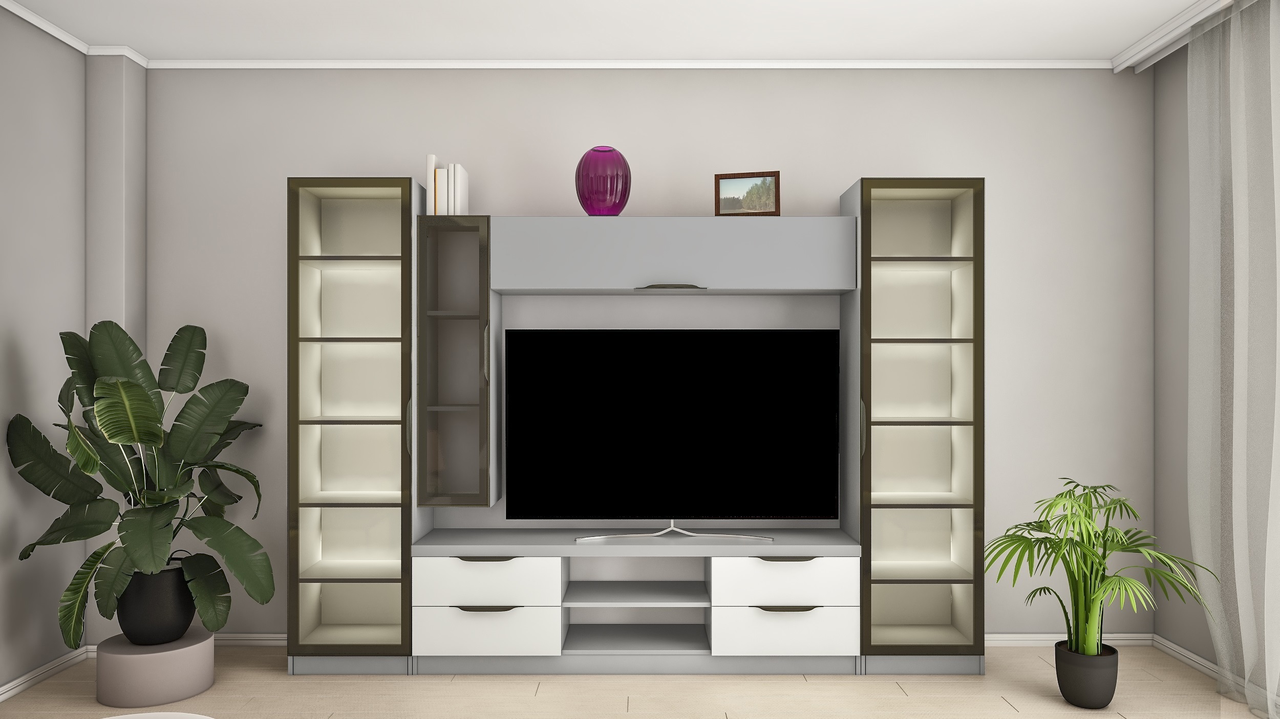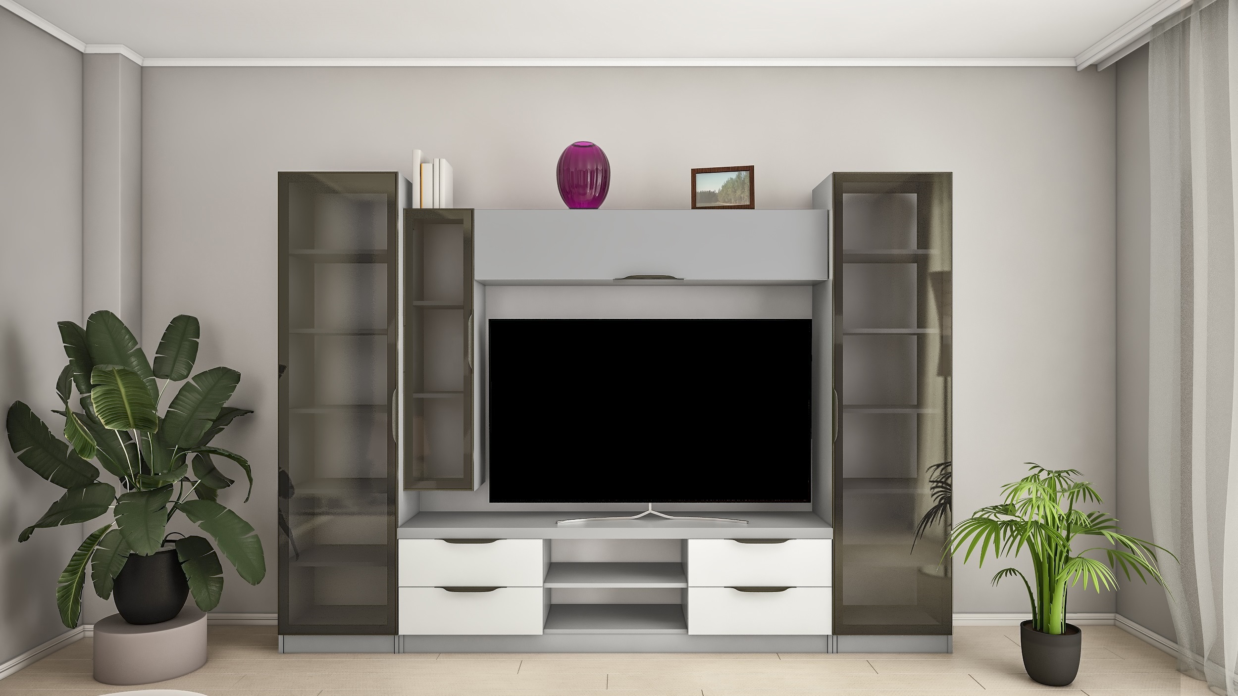 Fronturile din sticlă sunt încadrate în profil din aluminiu. Se utilizează sticlă fumurie (tonată), care oferă un aspect elegant și ordonat, ascunde conținutul dulapurilor și adaugă profunzime întregii compoziții. Acest detaliu conferă mobilierului un aspect mai modern și mai premium.