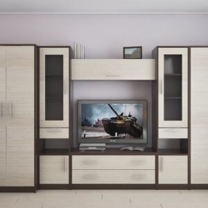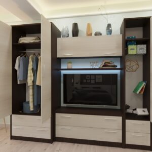 Mobilier perete „Iunosti” 2.25m – este realizată într-un stil clasic. Într-un dulap mare, puteți agăța haine de umerașe, puteți pune cărți sau obiecte de interior pe rafturi. În centru există un suport TV cu două sertare spațioase. Un model frumos care va crea un mediu interior modern și confortabil.