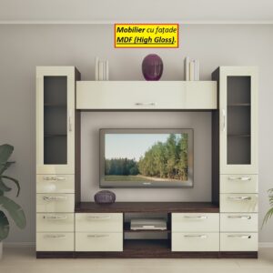 - Perete living X-7 (TV-1,2m) 2,6m–este o combinație ideală de PAL texturat și fațade din MDF lucios, elemente impecabil de practice și funcționale. Liniile drepte și mobilierul laconic, cu accent pe textura interesantă a PALului laminat și a fațadei lucioase, nu supraîncarcă interiorul, dar vor contribui la sublinierea ușoară a stilului camerei.