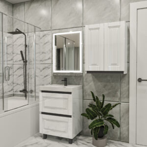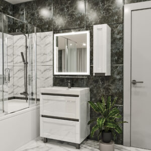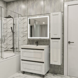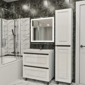 Состав комплекта (ШxГxВ): 110 х 46 х 193 (глубина раковины 46 см) Шкаф навесной ВНКК-147/30 (1шт.): 30 х 27 х 147 см - 3100 л. (Петли с доводчиками) Тумба напольная ВКК-80(2) (1шт.): 80 х 46 х 88 см - 5400 л. (Направляющие с доводчиками) Зеркало LED * (1шт.): 80 х 70 см - 1700 л. (* - с функцией подогрева ) Комплектуется керамическим умывальником Luxury-80 от Sanovit Раковина с переливным отверстием, и с отверстием для установки смесителя. ** - Смеситель и стеклянная полка приобретается ОТДЕЛЬНО !