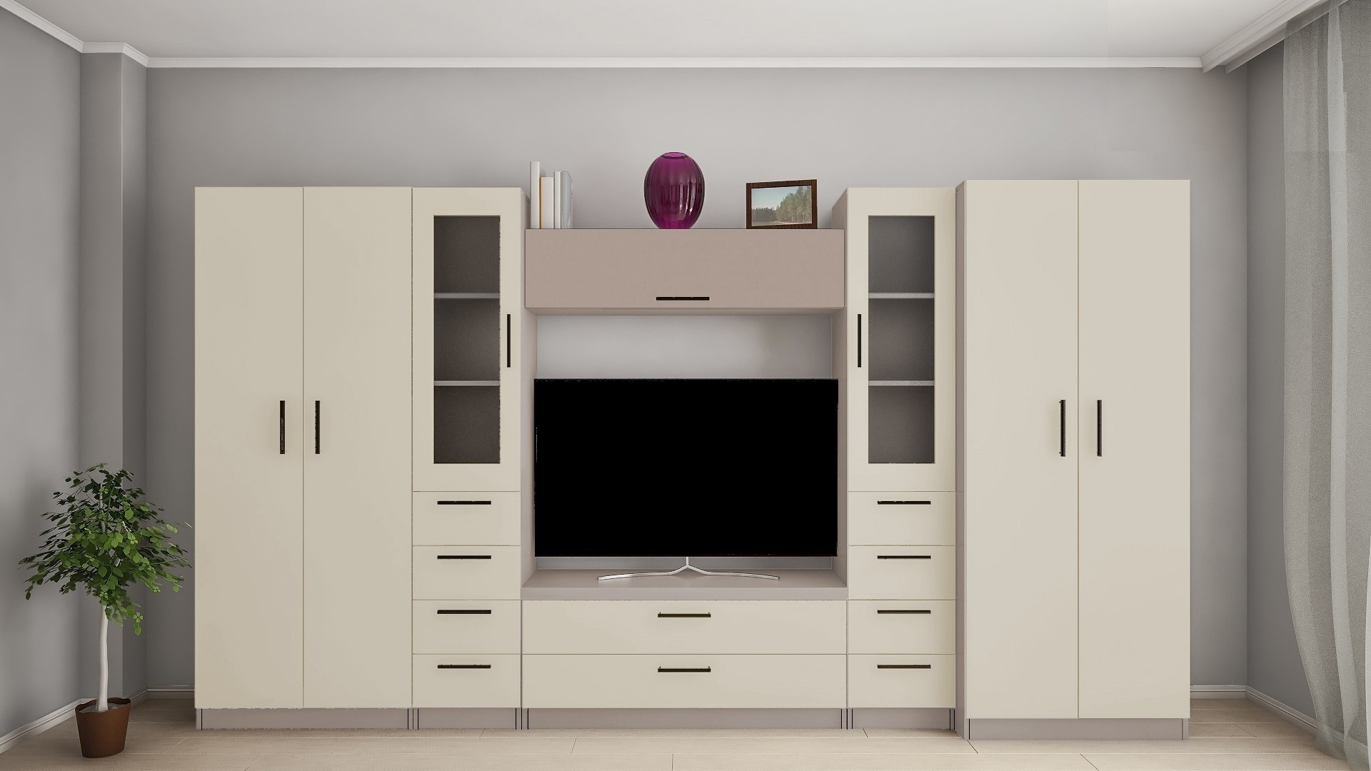 - Цвет ........... (Каркас) Тоффи. (Фасад ) Беж. Стекло тониров.Фасад ................................................................ ЛДСП 18ммКаркас .............................................................. ЛДСП 18ммСостав комплекта (ШxГxВ): 300х40х193 смВ стенку входят: Размер(ШхГхВ)