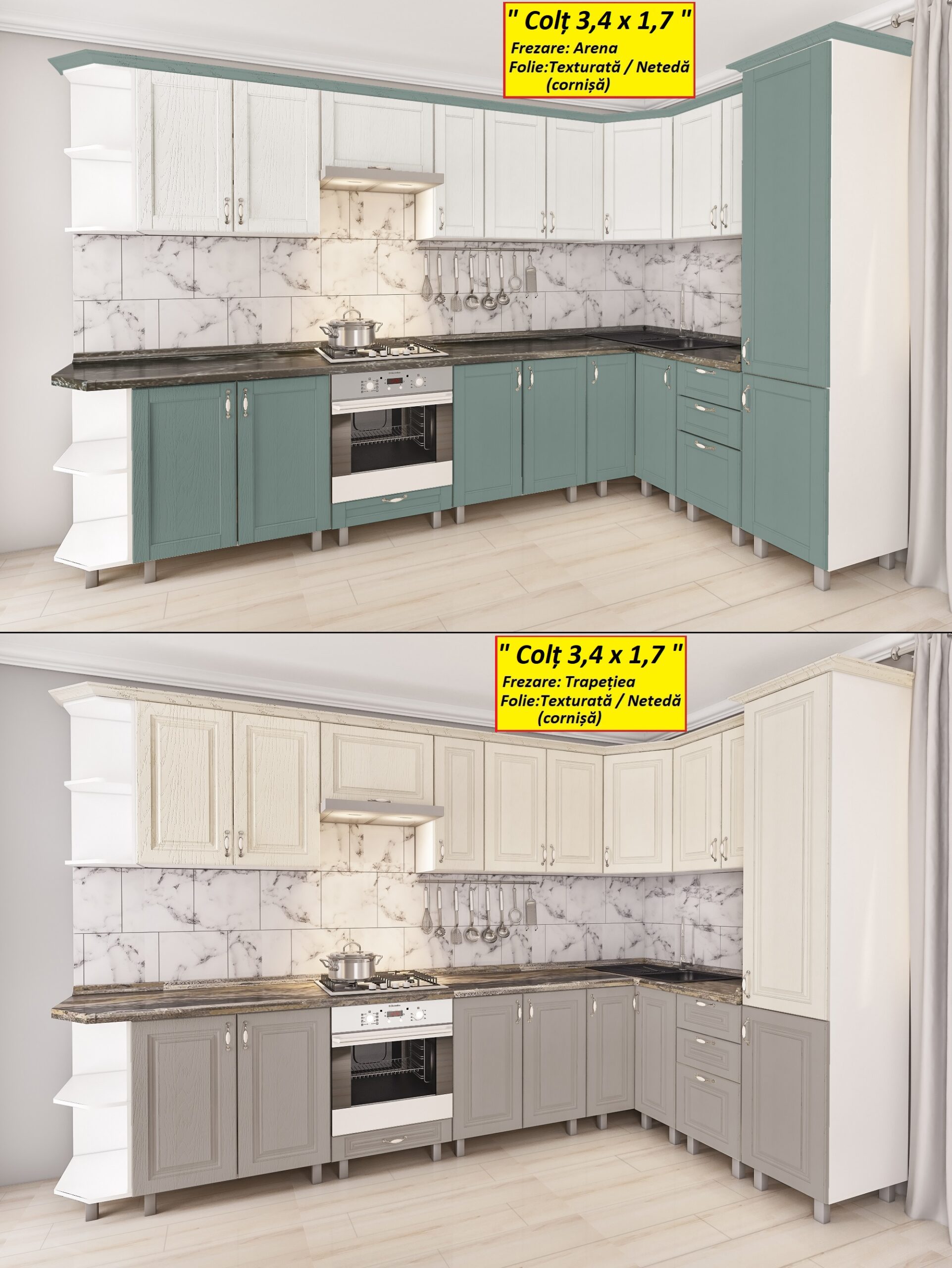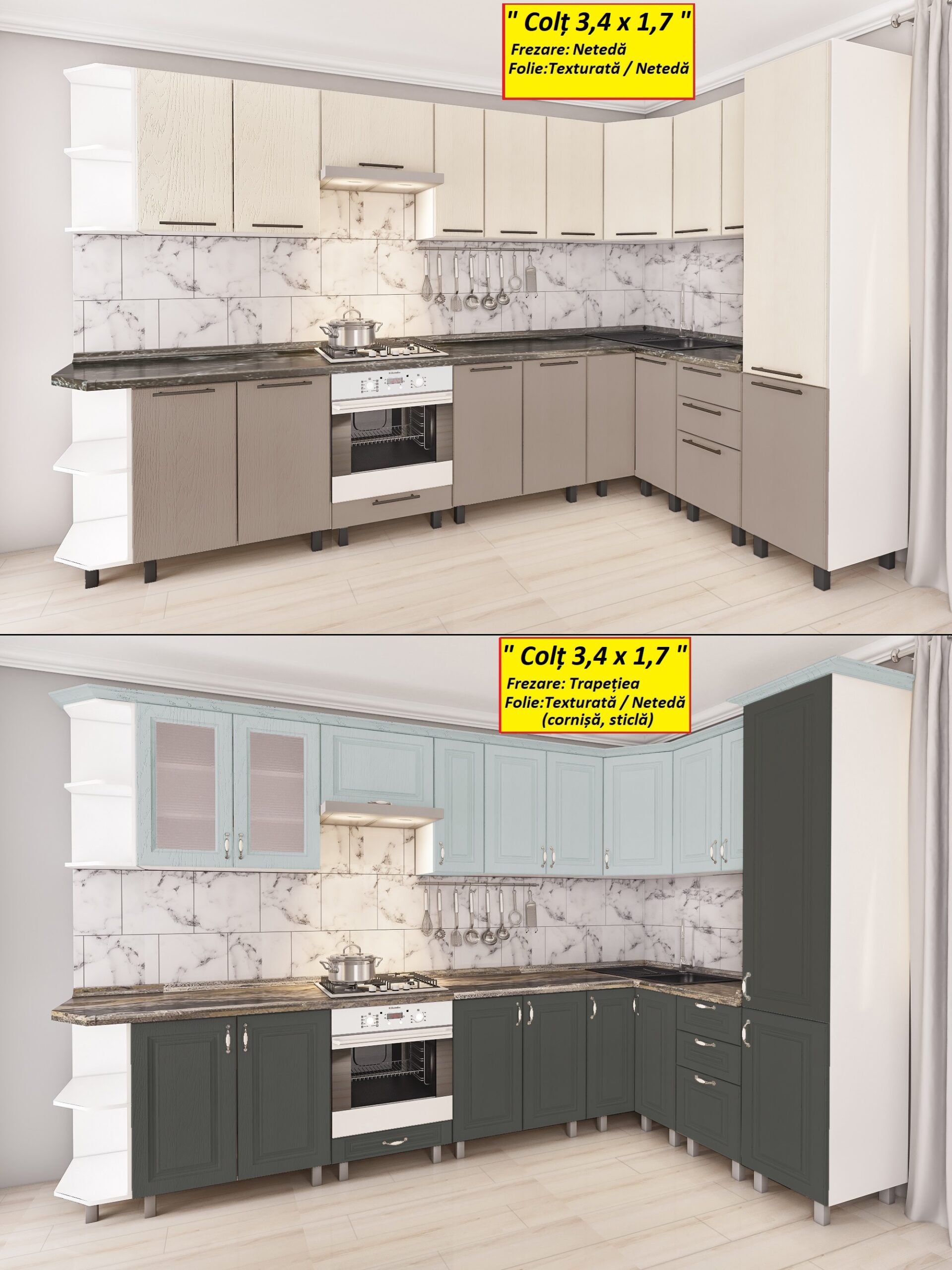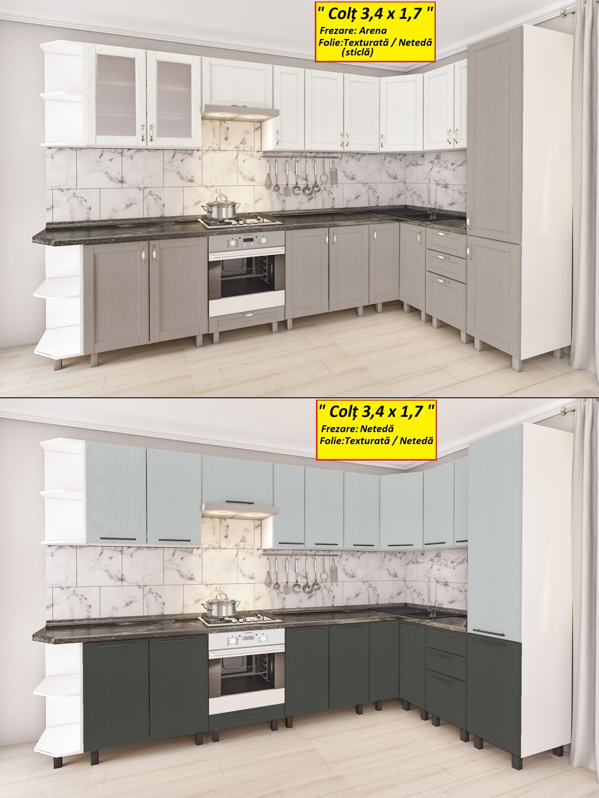 Угловая кухня 3,4х1,7м с фасадами из панелей МДФ-2 — это отличный вариант для стильного образа кухни, придающий аккуратность интерьеру. В кухнях МДФ, двери шкафчиков имеют рифлёный и привлекательный вид. Чтобы получить рифлёный узор, двери изготавливаются в заводских условиях под вакуумным прессом.